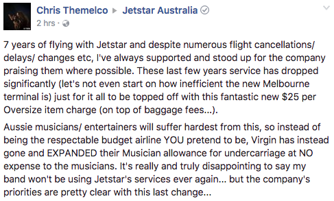 “Just wondering if you can justify the new ‘Oversize baggage handling fee’ that has just appeared out of no where and has totally fucked travelling musicians?” Brockman posted to the Jetstar Facebook page, also saying that he’d be “willing to carry the guitars to the plane for you if it’s THAT much of a hassle”.