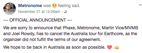 In their Facebook statement, Earthcore promoters also addressed what they called Coming Soon’s “vindictive advertised smear campaign”, saying they’re “seeking legal advice for damages to our festival and our lives” after he apparently inferred that Earthcore Victoria was cancelled.