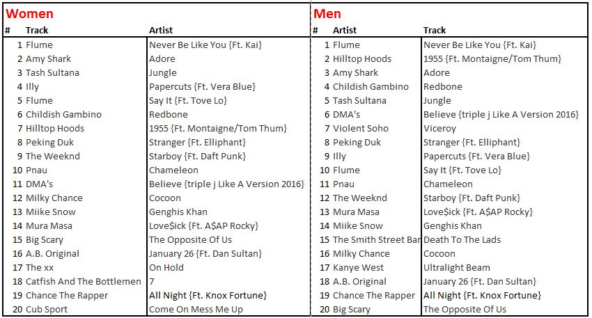 Looking now at the top 20 votes for men and women, both genders unequivocally elected Flume‘s Never Be Like You as their favourite song of 2016. The rest of the top 10 for both males and females was pretty similar overally, with Amy Shark, Tash Sultana, Illy, Childish Gambino and Hilltop Hoods making both top 10 lists.