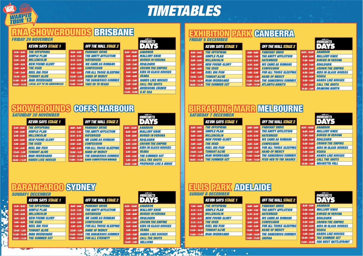 It’s nearly time for the Aussie resurgence of the Vans Warped Tour and today AJ Maddah and crew have unveiled that special piece of scheduling you’ve been hanging out for – the timetables for Brisbane, Coffs, Sydney, Canberra, Melbourne and Adelaide. Every leg of the tour!