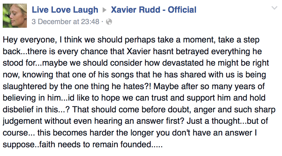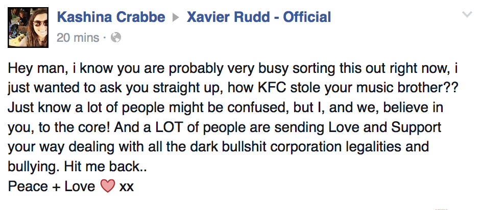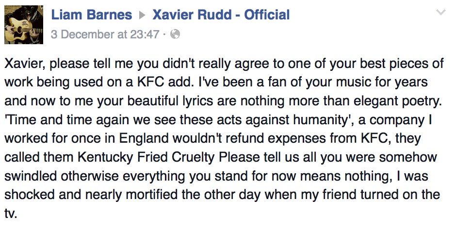 Singer-songwriter, vegetarian and People for the Ethical Treatment of Animals (PETA) supporter Xavier Rudd is copping some heat from his fans after his song Let Me Be appeared in a new commercial for fast-food giant KFC.